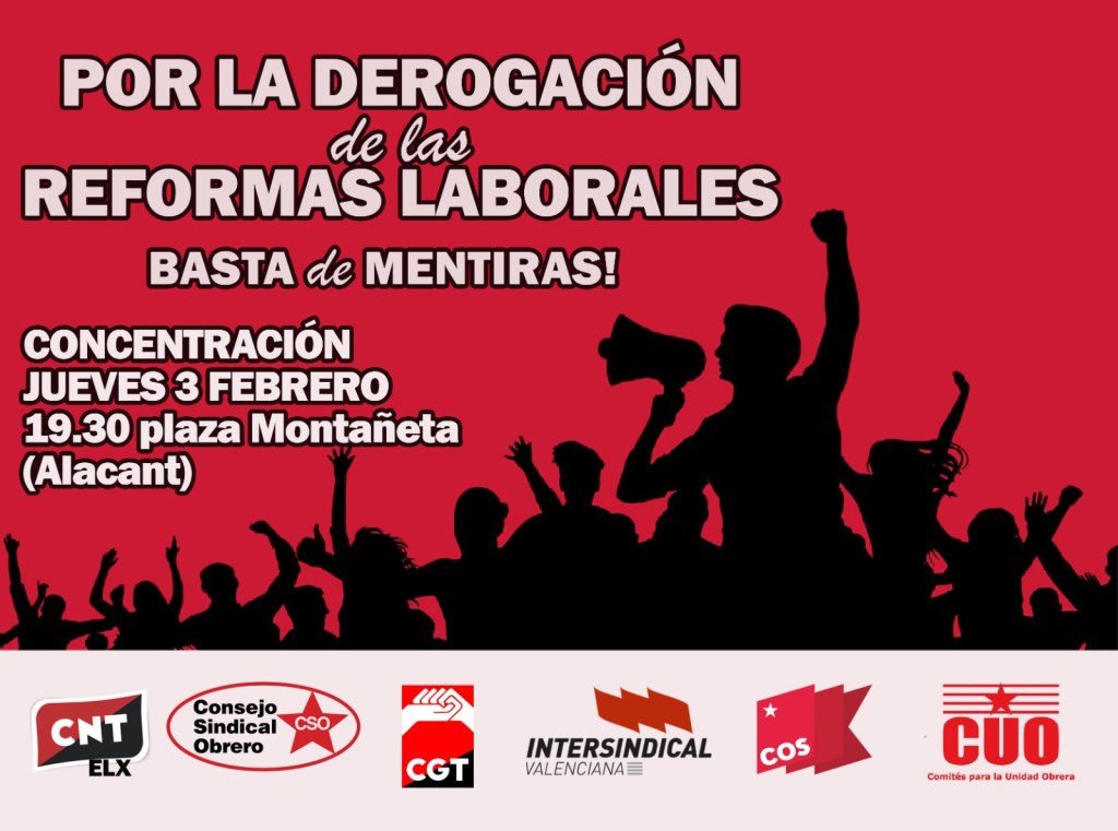 Para ello, convocamos a todas las trabajadoras y los trabajadores del estado a una concentración el día 3 de febrero a las 11 h., en Madrid, frente al Congreso de los Diputados (en Alicante nos concentraremos también ese día en la Plaza de la Montañeta, a las 19,30 h), para manifestar nuestra rotunda oposición a que se convalide el infame acuerdo y se convierta en Ley. En cualquier caso, seguiremos exigiendo que se deroguen las reformas laborales de 2010 y 2012 y no permitiremos que con este acuerdo se dé por solucionado un conflicto sin que las personas trabajadoras hayan recuperado los derechos perdidos con dichas reformas laborales.
