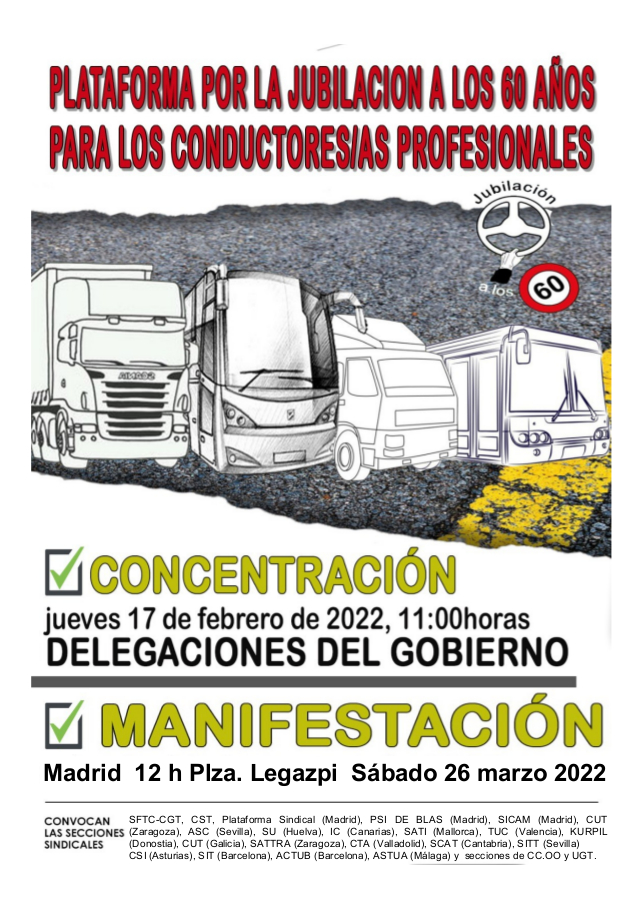 El próximo jueves 17 de febrero nos concentraremos a las 11 h. en la Plaza de la Montañeta para exigir la jubilación a los 60 años de las y los profesionales del transporte de personas y mercancías. CGT llama a sus afiliadxs a acudir en apoyo de las reivindicaciones de nuestrxs compañerxs.