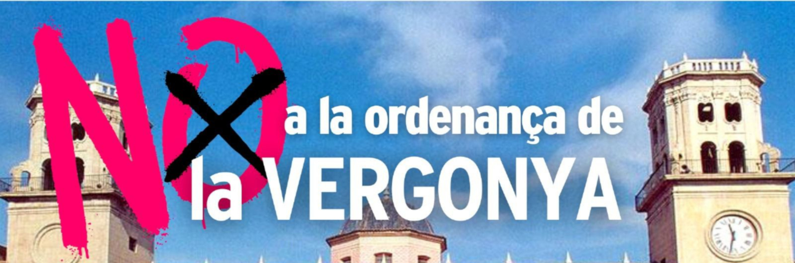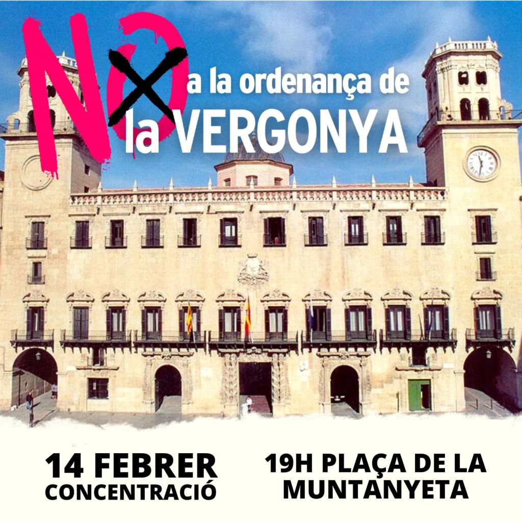 Tras su aprobación en Comisión, la ordenanza de la verguenza probablemente irá al Pleno del Ayuntamiento de Alicantel el lunes 15 para su aprobación definitiva. Decenas de colectivos y organizaciones, entre ellas CGT Alicante, hacen un llamamiento a la ciudadanía para que manifieste su repulsa a esta ordenanza asistiendo a esta convocatoria.