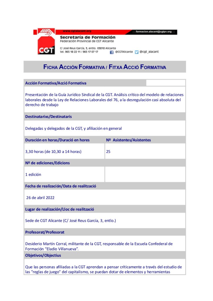 Para inscribirse en este nuevo curso, escribe a alacant@cgtpv.org diciendonos tu nombre, sindicato y un número de teléfono para comunicarte posibles incidencias, o llama al 965 18 22 11.