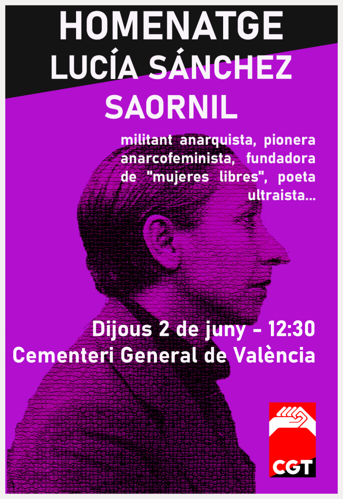 Desde la Secretaría de la mujer de la Federación Local de CGT en Valencia se ha convocado un acto para rendir homenaje a Lucía Sánchez Saornil la mañana del jueves 2 de junio, a las 12:30 horas, en el cementerio general de València donde se encuentra enterrada. La organización anarcosindicalista, que viene realizando este homenaje durante 11 años, se ocupó el año pasado de rehabilitar la sepultura en la que se encuentran los restos de Lucía Sánchez Saornil.