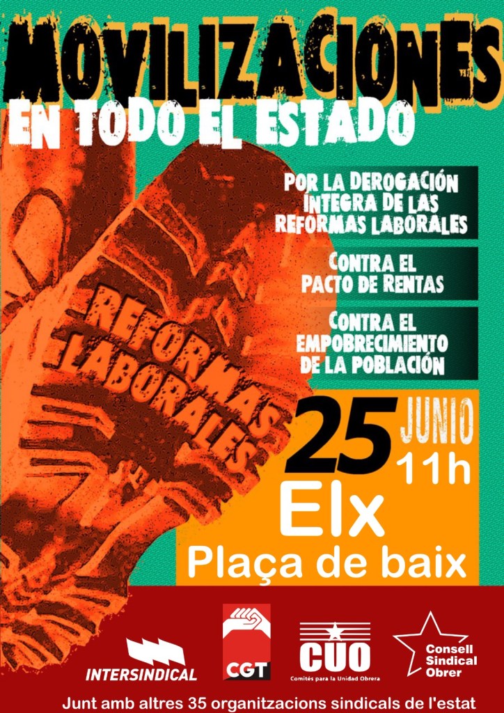 La CGT, junto a otras organizaciones sindicales y sociales convoca manifestaciones en todo el estado contra las reformas laborales. En la provincia de Alicante, la Confederación convoca a su afiliación el 25 de junio a las 11 h. en la Plaza de Baix de Elche
