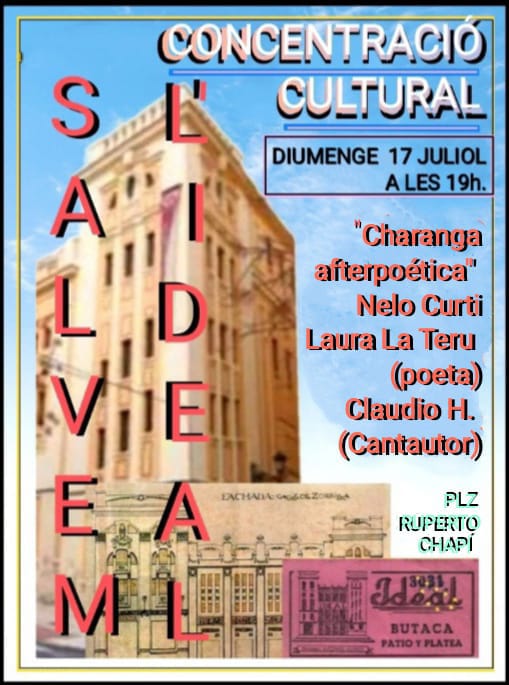 Desde la Plataforma nos animan a asistir al evento de este domingo: «Debemos mostrar que los ciudadanos queremos que el Cine Ideal, sea de uso Cultural, público y sea adquirido por GVA como votamos en los Presupuestos Participativos. Todo esto se guisa en estos momentos, vente, se te necesita. Además, lo pasaras bien con la performance » actuaciones que podrían verse en el Ideal».