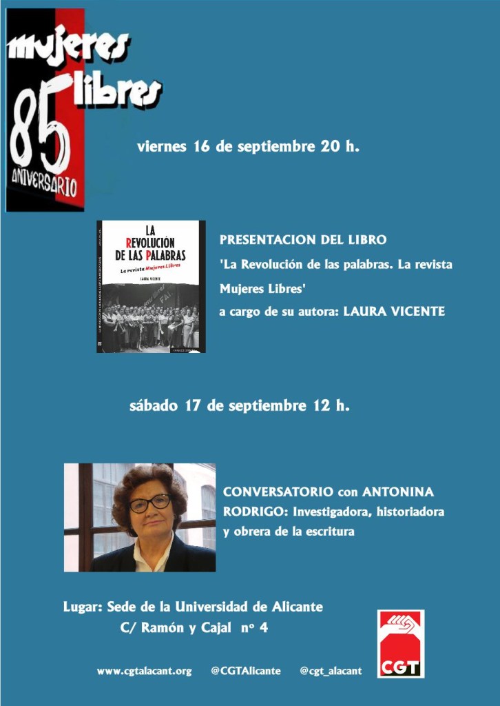 El viernes 16 y sábado 17 de septiembre la Confederación General del Trabajo de Alicante ha programado dos actos, en la sede de la UA, recordando la creación de la organización Mujeres Libres. El viernes 16, a las 20 horas, podremos asistir a la presentación del libro La revolución de las palabras. La revista Mujeres Libres, y el sábado 17, a las 12 horas, teníamos previsto un diálogo con Antonina Rodrigo, que por problemas de salud no podrá asistir. El acto se mantiene como un debate/diálogo entre las y los asistentes.