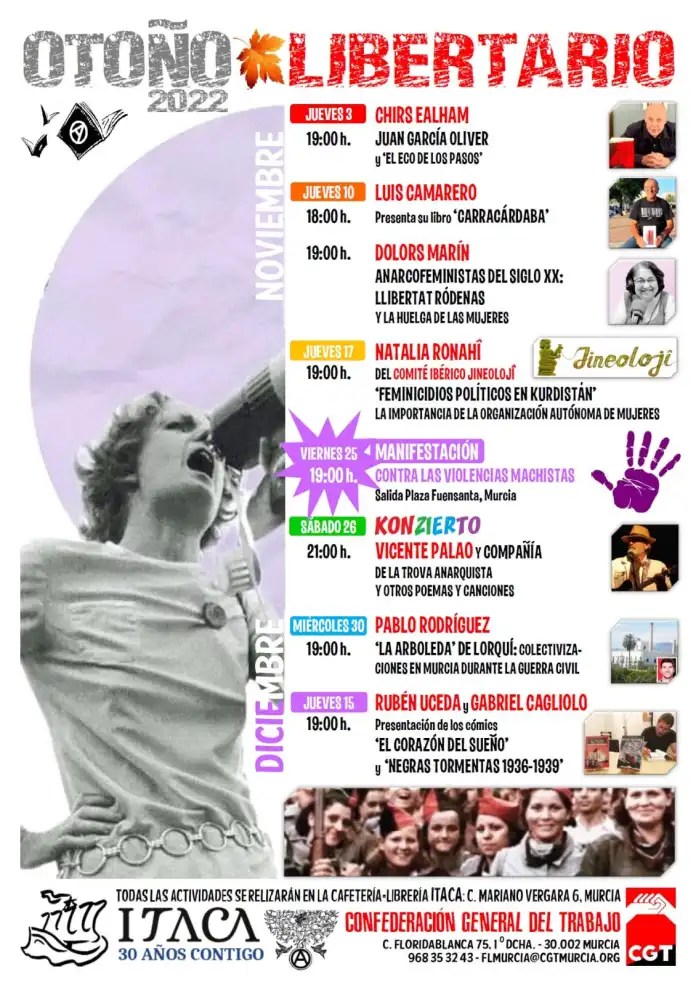 Desde el Secretariado de Cultura de CGT Murcia hemos elaborado unas Jornadas Libertarias con el título de “Otoño Libertario”: Presentaciones de libros, comics, conferencias y música, a realizar en la Cafetería Librería Itaca de Murcia.