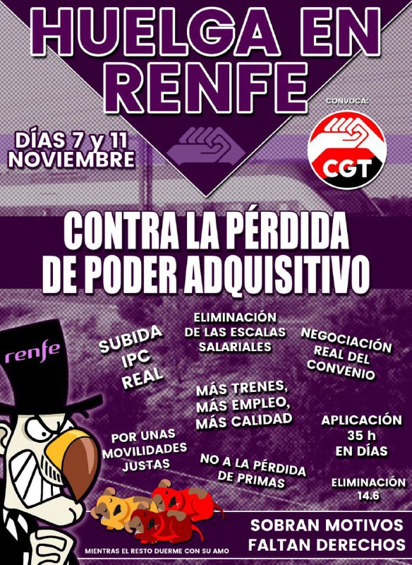 CGT, consideramos necesario convocar huelgas los días 7 y 11 de noviembre ante la pasividad de los sindicatos que ostentan la mayoría. SEMAF, UGT y CCOO han desconvocado sus huelgas sin conseguir avances ni medidas concretas. Nosotros, sin embargo, consideramos necesario movilizarnos por nuestros derechos y los derechos de quienes utilizan los servicios ferroviarios.