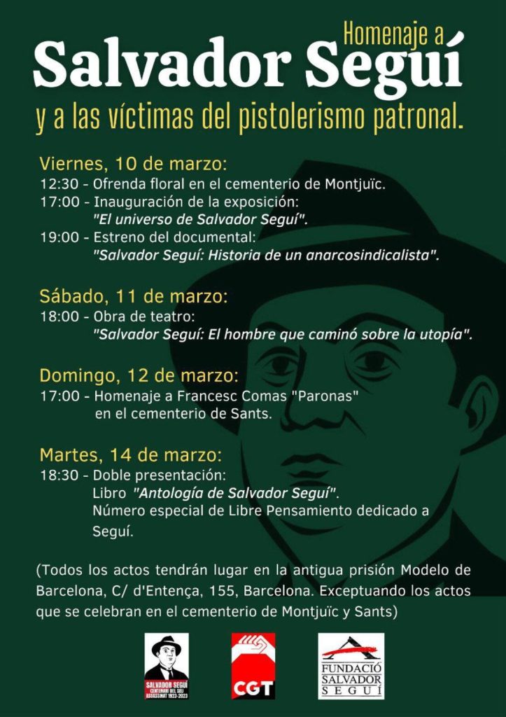 Tras su aprobación en la plenaria confederal del mes de septiembre, la CGT junto a la Fundación Salvador Seguí, hemos organizado una serie de actos (se adjunta cartel) para rendir homenaje a Salvador Seguí y a todas las víctimas del pistolerismo patronal.