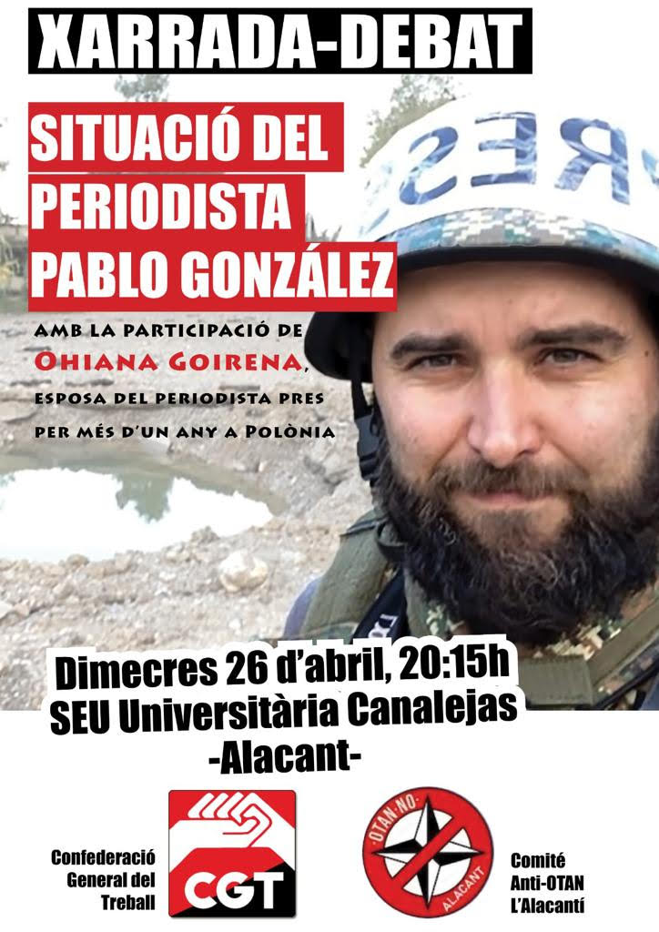 Organizada por el Comité Anti-OTAN L’Alacantí, en el que participa CGT Alacant, el próximo miércoles 26 de abril a las 20,15 h en la SEU Universitaria de C/ Canalejas tenemos una charla debate sobre la situación de Pablo González, periodista español preso desde hace más de un año en Polonia