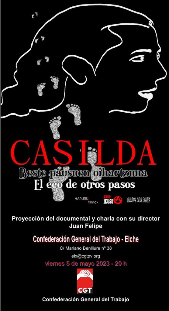 Presentación en Elche del último trabajo de Juan Felipe (director de películas como El tiempo de las cerezas o Indomables: Una historia de Mujeres Libres) el documental titulado: «Casilda. El eco de otros pasos», un necesario ejercicio de memoria y recuperación sobre la figura de una mujer de su época, Casilda Hernáez (1914-1992), militante libertaria, miliciana y una más de las miles de mujeres organizadas en el movimiento anarquista (CNT, FAI, Mujeres Libres o las Juventudes Libertarias) de los años 30.