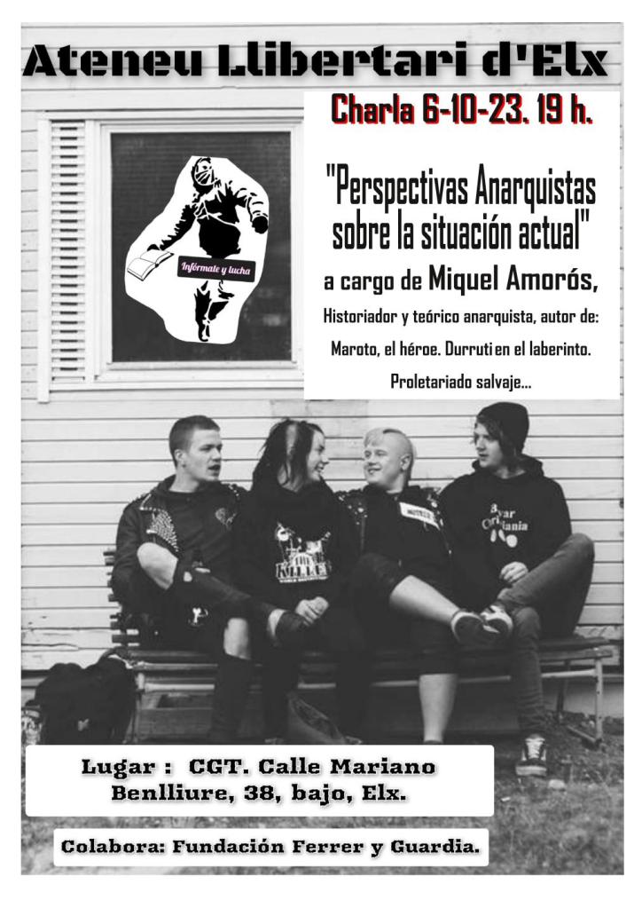 Con el título «Perspectivas anarquistas sobre la situación actual», el próximo viernes 6 de octubre a las 19 horas podremos escuchar y dialogar con el historiador y teórico de las ideas libertarias Miquel Amorós en la sede de la CGT en Elx C/ Mariano Benlliure nº 38 bajo