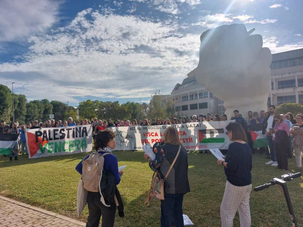 A partir de las 11 h en el Campus de la UA y convocada por la Asamblea Universitaria Palestina Alicante (AUPA) y el Sindicato de Estudiantes, cientos de personas se concentraron para leer un manifiesto de denuncia de la situación de Gaza y manifestar su solidaridad con las y los palestinos. Paralelamente, se convocó una huelga estudiantil en todo el campus, en coordinación con otras universidades y centros de estudios del País Valenciano, que permitió a las y los estudiantes sumarse a la manifestación que partió de las escaleras del Jorge Juan y reunió a miles de estudiantes y trabajadorxs.