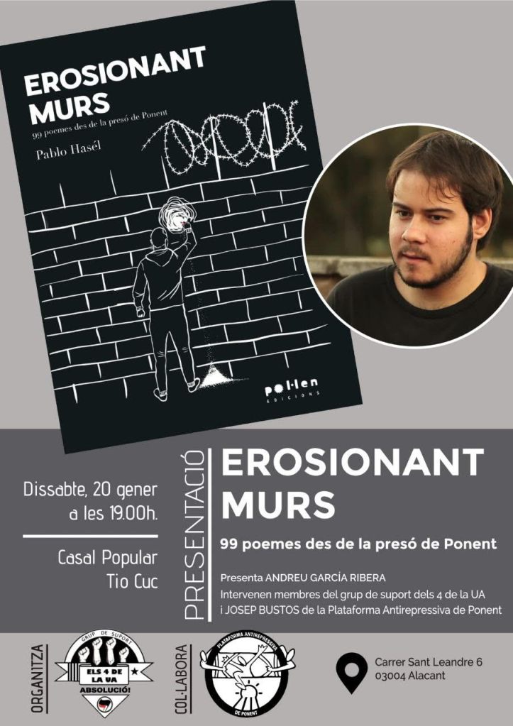 El sábado 20 de enero a las 19 horas presentación del libro de poemas de Pablo Hasél a cargo de Andreu García Ribera, miembros del Grupo de Aoyo a los 4 de la UA y Josep Bustos, de la Plataforma Antirepressiva de Ponente en el Casal Popular Tio Cuc
