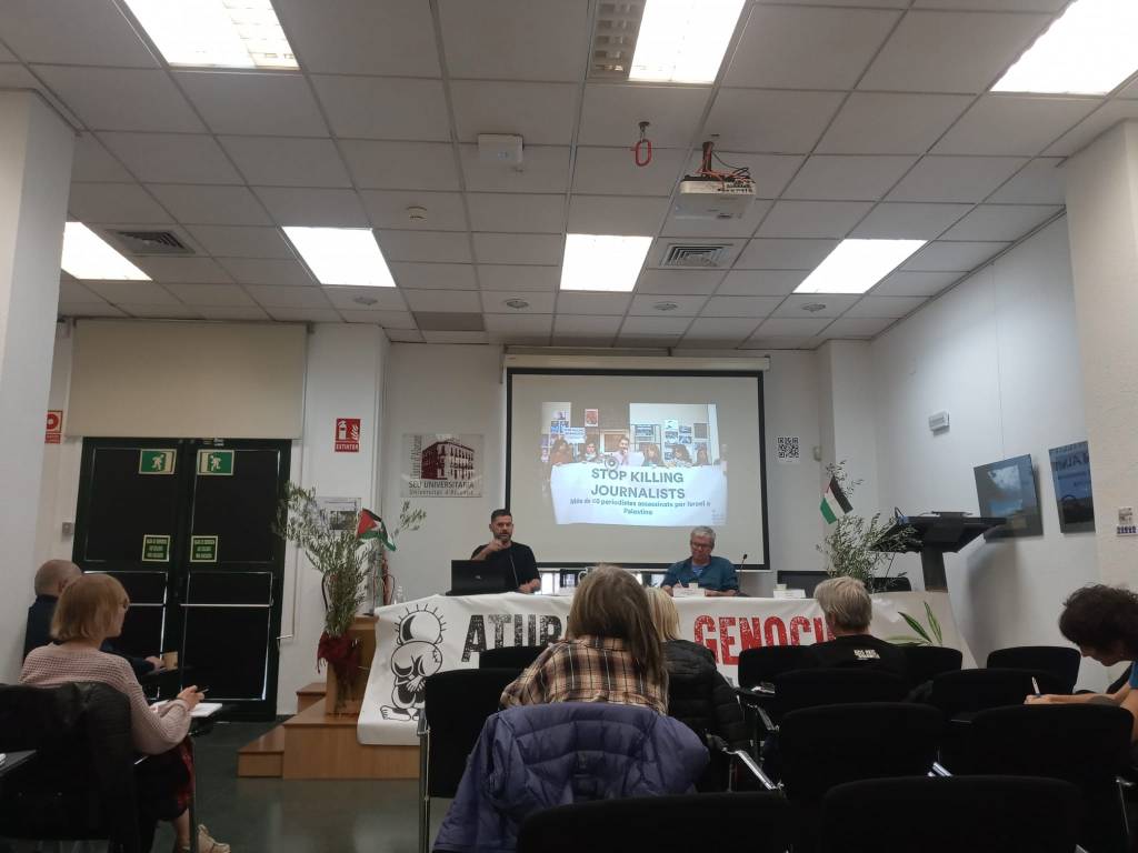 Las Jornadas continuaron con la charla de David Segarra, documentalista y periodista, sobre Periodismo y hegemonía. Resistencia y humanidad. Describiendo la situación de las y los palestinos en estos momentos de genocidio, centrándose en los asesinatos de periodistas palestinos realizados por el ejercito israelí como parte de un plan para impedir que se informe sobre su actuación genocida en Gaza.