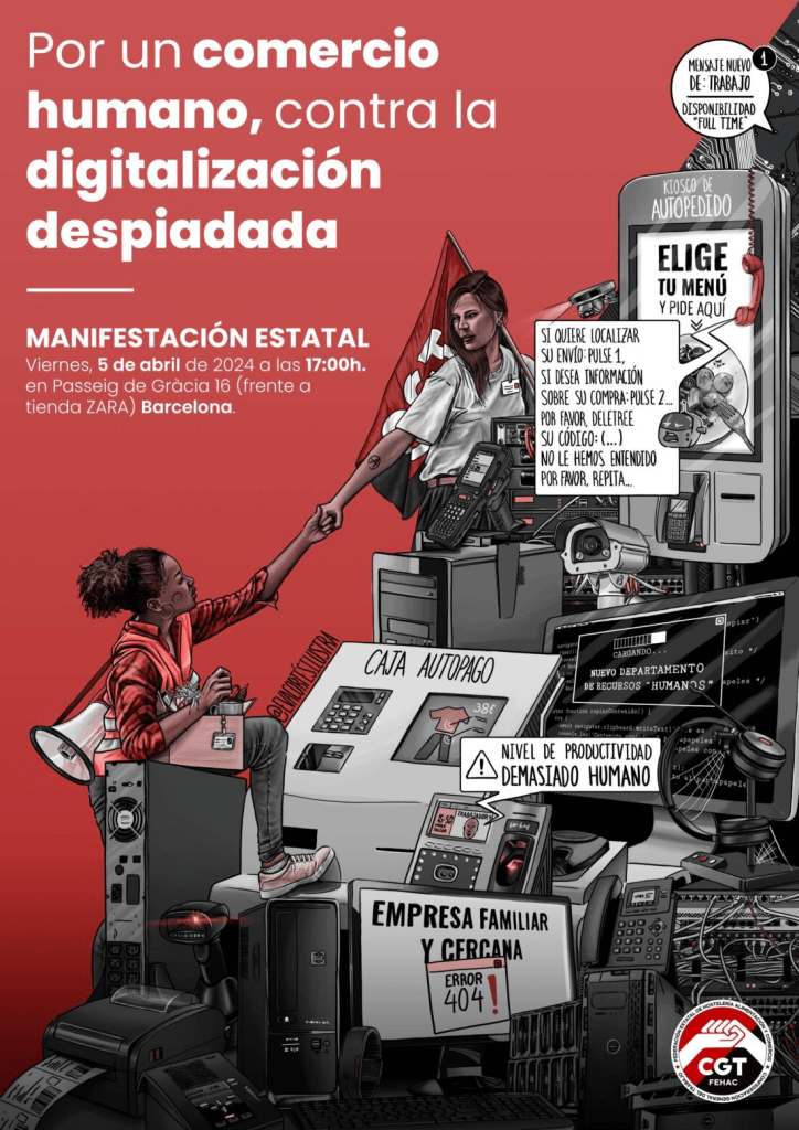 La Federación Estatal de Hostelería, Alimentación y Comercio de la Confederación General del Trabajo (CGT) convoca a una manifestación en Barcelona para el próximo viernes 5 de abril a las 17:00, bajo el lema «Por un comercio humano, contra la digitalización despiadada». La marcha se iniciará en las inmediaciones de ZARA y recorrerá emblemáticas tiendas como H&M, Stradivarius, Pull&Bear, APPLE y El Corte Inglés.