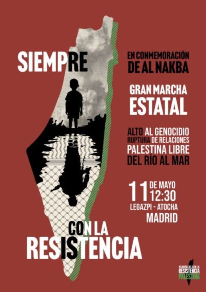 Desde CGT apoyamos todas las movilizaciones que se convoquen para denunciar este genocidio, y llamamos a toda la afiliación y a toda la ciudadanía a apoyar y secundar la gran manifestación centralizada que se convoca el próximo 11 de mayo en Madrid, de Legazpi a Atocha, a las 12:30 horas, y a la que organizaciones palestinas estructuradas en la Plataforma «Asamblea con la Resistencia Palestina» nos llaman. Adjuntamos el cartel de la convocatoria.