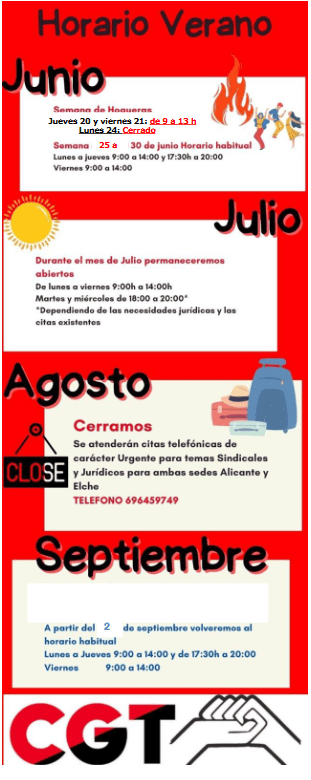 Horario CGT Alacant junio/septiembre Publicado porcgtalacant20 de junio, 2024Publicado en NoticiasEtiquetas:CGT Alacant, Horarios de Hogueras, Horarios de verano Aquí tenéis los horarios de apertura para Hogueras y los meses de verano de nuestra sede en Alicante CGT Alacant Comparte esto: Compartir en X (Se abre en una ventana nueva) X Comparte en Facebook (Se abre en una ventana nueva) Facebook Me gusta Cargando... Relacionado Publicado por cgtalacant Somos la Federación Provincial de sindicatos de CGT Alacant. El sindicato libertario, solidario y autogestionado, por y para la clase trabajadora. ¡El sindicato que se atreve! Ver más entradas