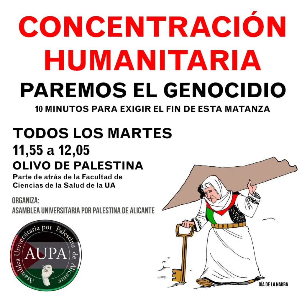 Desde AUPA (Asamblea Universitaria por Palestina de Alicante), con el apoyo de la Sección Sindical de CGT en la UA, BDS y otras organizaciones, se están convocando a la comunidad universitaria a concentraciones semanales y charlas en el campus universitario en apoyo al pueblo palestino. Además de buscar que la UA declare el Boicot Académico contra las instituciones israelíes que apoyan la matanza y exigiendo a las autoridades universitarias un claro apoyo a universidades, profesorado y estudiantes palestinas arrasadas por el ejército colonizador.