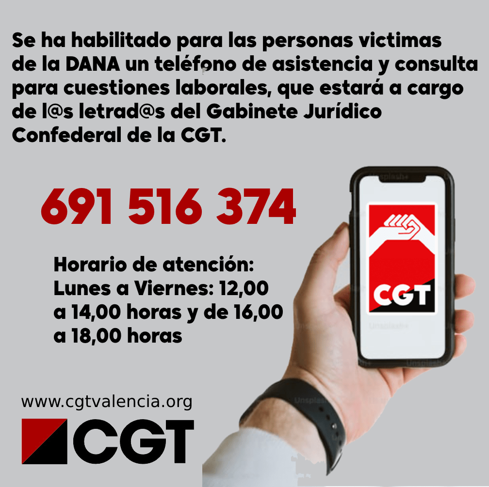 En cuanto al ámbito más estrictamente laboral, la F.L. De València se ha puesto a disposición de las trabajadoras a las cuales su jefe, en situación de emergencia, obligó a trabajar o permanecer en el trabajo, para poder denunciar esta situación. Además, se ha habilitado un teléfono – 691516371 – de asistencia y consulta para las personas víctimas de la DANA para cuestiones laborales, a cargo de las abogadas del GJC (Gabinete Jurídico Confederal).