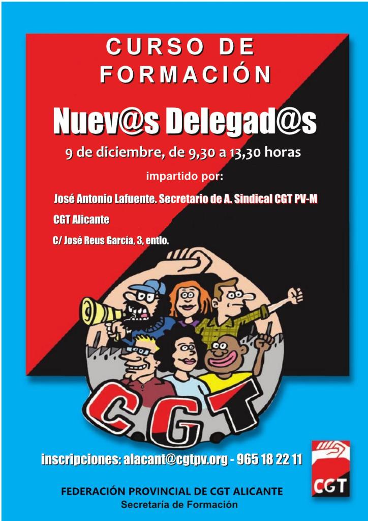 El próximo 9 de diciembre, de 9,30 a 13,30h, en el local de CGT Alicante (C/ José Reus García nº3, bajo) se celebrará una sesión formativa dedicada a la formación de las y los nuevos delegados de CGT
