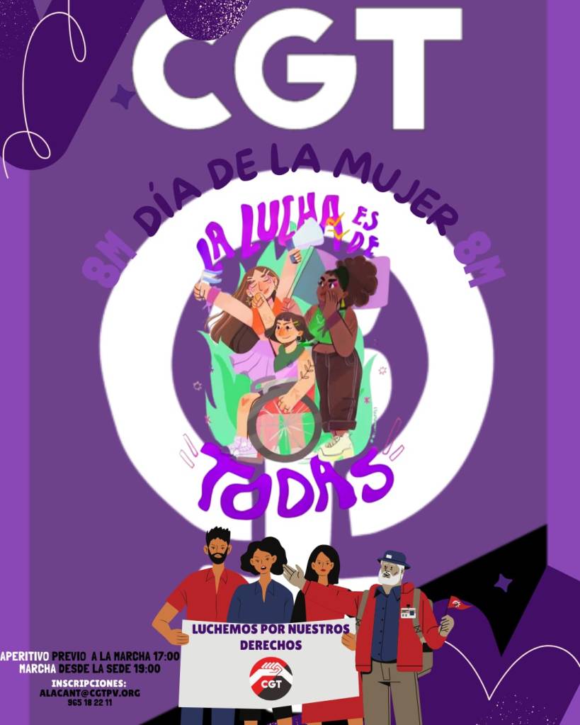 CGT Alicante se suma a la manifestación convocada por Mujeres Feministas de Alicante, el 8 de marzo con salida a las 18h desde la Plaza de Luceros. Con anterioridad a la manifestación, a las 16,30 h., la Federación Provincial de CGT Alicante convoca a la afiliación a un café y dulces en su sede de C/ José Reus García n. 3, para salir a las 17h hacia la manifestación. Se pide confirmar asistencia.