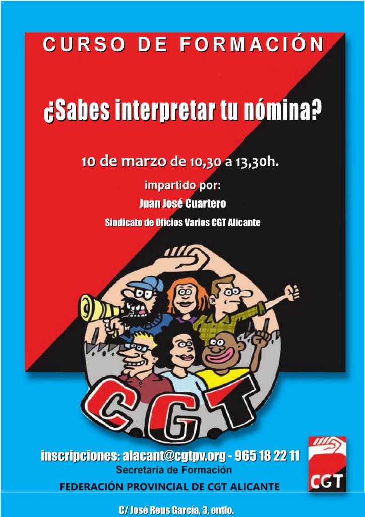 El lunes 10 de marzo a las 10,30h se celebra un nuevo curso en la sede de CGT Alicante ¿Sabes interpretar tu nómina?. El curso será impartido por Juan José Cuartero, compañero del Sindicato de Oficios Varios de CGT Alicante y delegado sindical de Bonysa, con gran experiencia sindical basada en años de militancia.