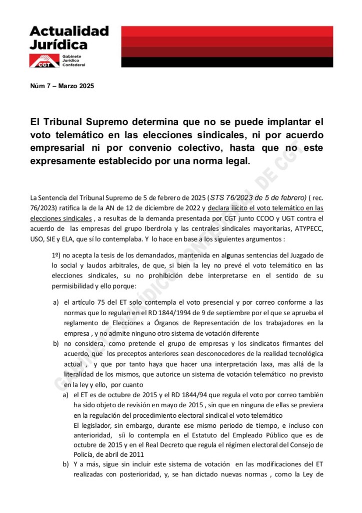 El Gabinete Jurídico de CGT realiza la séptima entrega sobre actualidad jurídica donde analiza la sentencia del Tribunal Supremo ha determinado que no se puede implantar el voto telemático en las elecciones sindicales –ni por acuerdo empresarial ni por Convenio Colectivo- hasta que no esté expresamente establecido por una normativa legal.