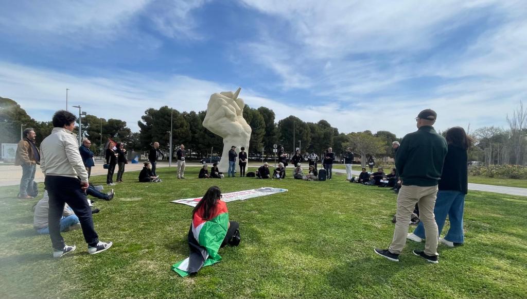 Este acto se inscribe en las convocatoria realizadas en 46 universidades públicas del Estado español por la Red Universitaria por Palestina (RUxP) para exigir un posicionamiento claro a los estamentos universitarios frente algenocidio.
