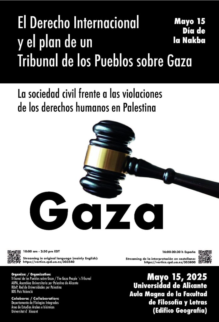 La Asamblea Universitaria por Palestina de Alicante, AUPA, invita a la reunión informal que celebrará el próximo jueves 15 de mayo el Tribunal de los Pueblos sobre Gaza, abierta a expertos, miembros de la comunidad universitaria, activistas por Palestina y ciudadanía interesada.