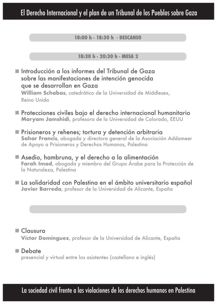 La reunión se llevará a cabo de 16 a 20:30 horas en la Facultad de Filosofía y Letras de la Universidad de Alicante. Está organizada conjuntamente por la profesora de Derecho Internacional y Derecho de los Refugiados de la Universidad de Boston, Susan Akram, con la Asamblea Universitaria por Palestina de Alicante (AUPA) y la Red Universitaria por Palestina (RUxP). Participarán a través de internet expertos colaboradores del Tribunal de Gaza desde Palestina, Jordania, Irlanda, EEUU, Canadá y diversos lugares de España, y otros presentes en Alicante. La entrada al encuentro es libre hasta completar el aforo, y será también transmitido por streaming en inglés y castellano a través de los enlaces https://vertice.cpd.ua.es/303540 (lengua original, inglés en su mayor parte) y https://vertice.cpd.ua.es/303800 (interpretación al castellano).