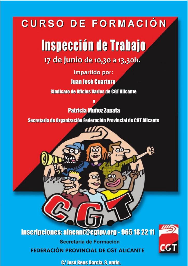 Desde la Secretaría de Formación de la Federación Provincial de CGT Alicante nos anuncian la convocatoria de una nueva sesión formativa destinada a la afiliación de CGT: Curso sobre Inspección de Trabajo, el martes 17 de junio de 10,30 a 13,30 horas.