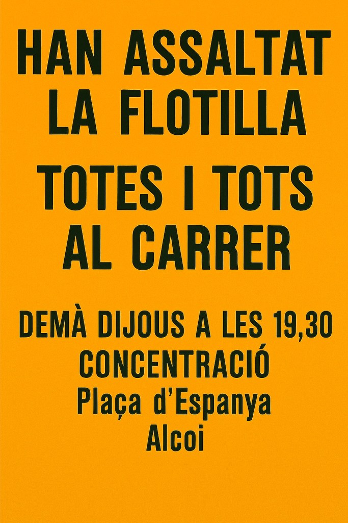 CGT hace un llamamiento al conjunto de la sociedad para unirse a todas la movilizaciones convocadas de apoyo a la Flotilla, para desde nuestros lugares de trabajo, barrios, centros de enseñanza y entornos, reivindiquemos con más fuerza que nunca la libertad para Palestina, el fin del genocidio, sanciones contra Israel y la libertad inmediata de nuestras compañeras. Tiene que ser un clamor mundial, tal y como han reivindicado nuestrxs compañerxs italianxs que han convocado una huelga general en su país. Una iniciativa que en el Estado español realizamos el 27 de septiembre del año pasado y que no descartamos volver a convocar junto con multitud de organizaciones sociales y sindicatos combativos. Debemos forzar a nuestros gobiernos a pasar de las palabras a la acción y terminar de una vez por todas con este crimen contra la humanidad. Lo que está ocurriendo es intolerable y hay que frenarlo por todos los medios posibles.