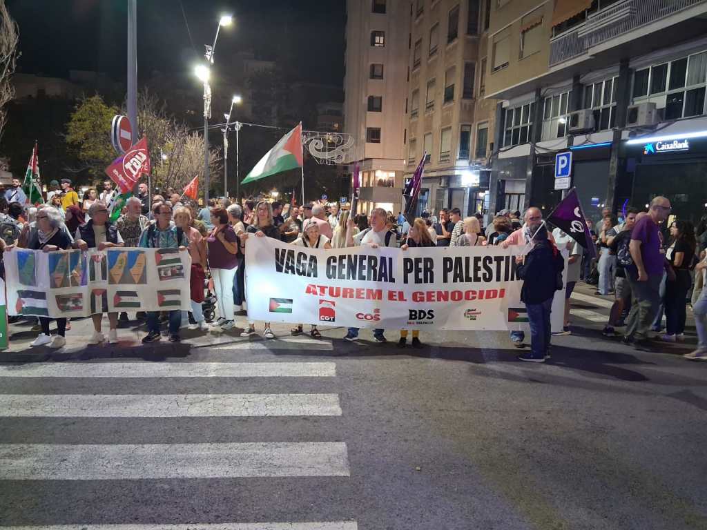 Compañeras y compañeros de la CGT de Alicante ha constituido su propio bloque dentro de la manifestación, sosteniendo una pancarta con el lema Vaga General per Palestina. Aturem el genocidi, recorrieron las distintas calles hasta el final del acto en la Plaza de la Montañeta.