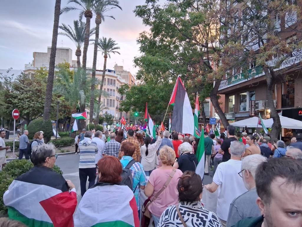 A partir de las 19 horas se fueron reuniendo junto a la plaza de toros las personas que participarían en la manifestación que cerraría la jornada de lucha en solidaridad con Palestina en Alicante. Miles de manifestantes recorrieron la Av. Alfonso el Sabio con cientos de banderas palestinas y pancartas de las organizaciones, sindicatos y partidos que apoyaban con sus gritos el derecho del pueblo palestino a su tierra y el cese de la coonización sionista, además de condenar el genocidio que ha estado cometiendo el ejercito israelí.
