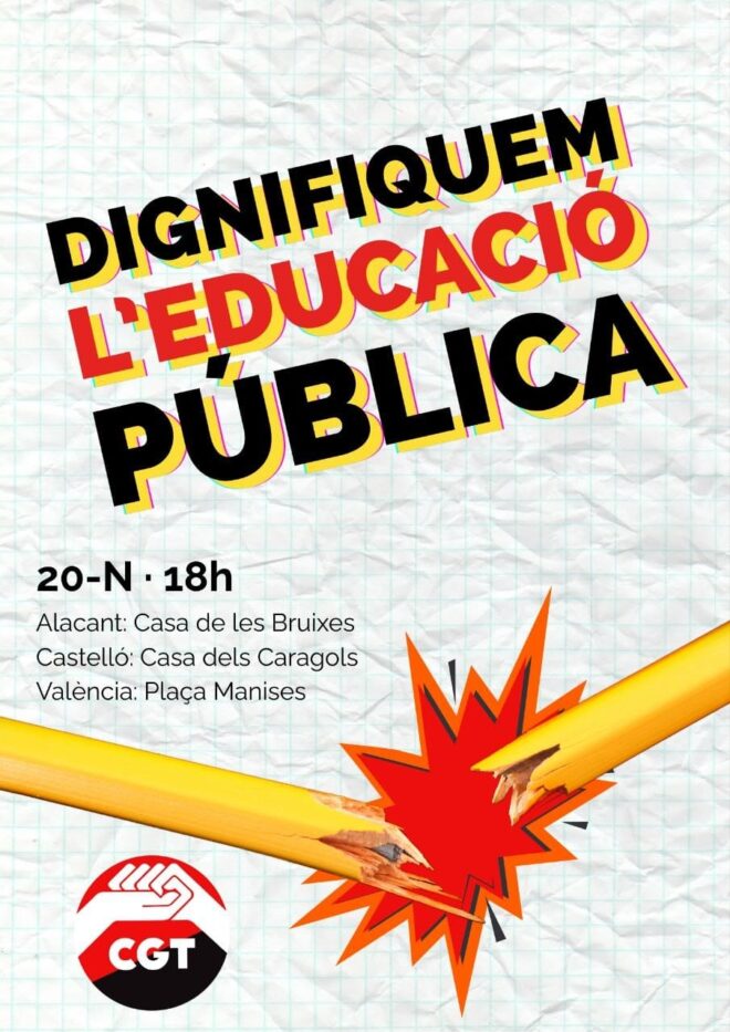 La Secció Sindical d’Ensenyament de la CGT València dona suport a les mobilitzacions que la comunitat educativa del País Valencià arrenca aquest dijous, 20 de novembre per la dignificació de la tasca docent.