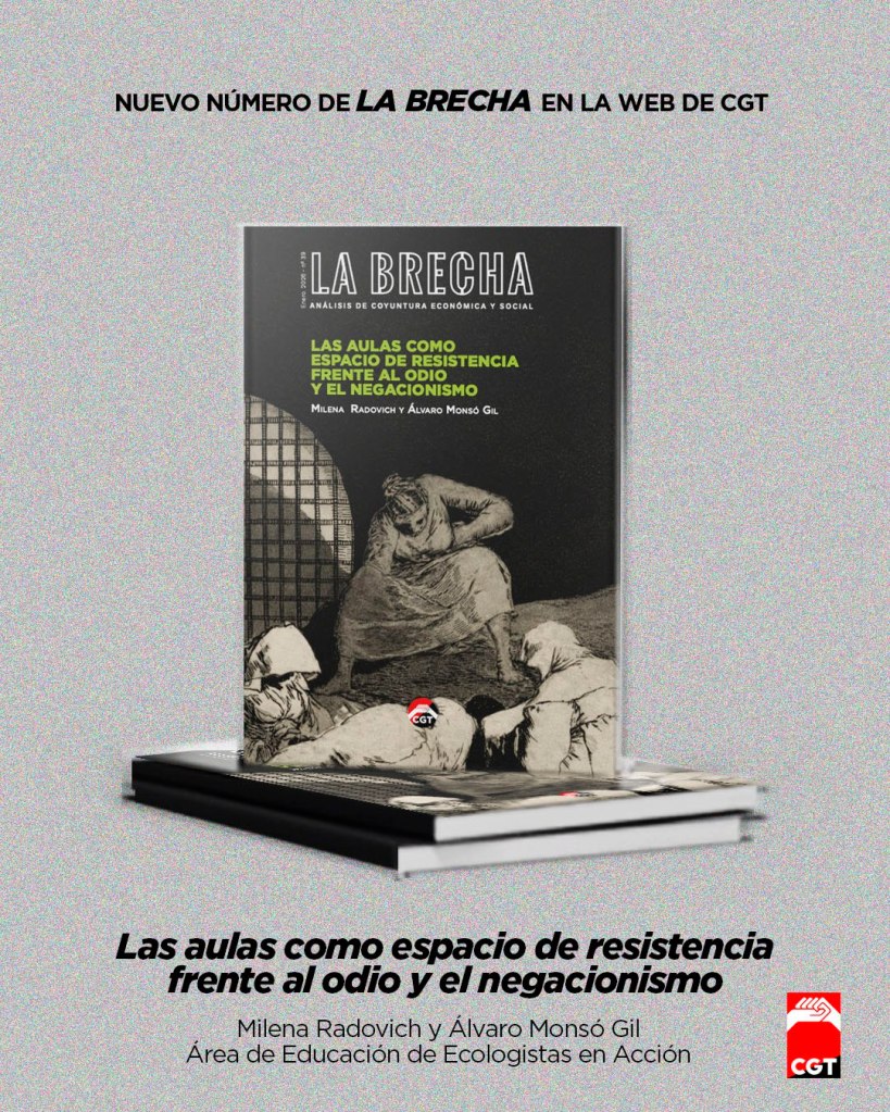 La Brecha es una publicación orientada para dar visibilidad a las distintas realidades laborales y circunstancias sociales y económicas que vivimos la clase trabajadora. Este número de enero de la publicación, el 39, queremos hablar sobre “las aulas como espacio de resistencia frente al odio y el negacionismo”. Un texto escrito a cuatro manos entre Milena Radovich y Álvaro Monsó Gil, que en su inicio introduce sus intenciones: “No es noticia que la extrema derecha avanza como una apisonadora global. En la última década, figuras como Milei, Le Pen, Orbán, Meloni o Trump evidencian una ola reaccionaria cuya capacidad de seducción popular parece imparable. Mientras tanto, las izquierdas parecen incapaces de articular una respuesta que atraiga a quienes más sufren la crisis multidimensional del capitalismo contemporáneo. Nuestro territorio no es una excepción: antifeminismo, anti-inmigración, ultraliberalismo, neoconservadurismo religioso y negacionismo ecosocial forman los ingredientes de una misma receta. En este número de La Brecha planteamos tres cuestiones esenciales: ¿De dónde surge el auge del autoritarismo reaccionario entre los jóvenes y qué peso tiene el negacionismo ecosocial? ¿Qué papel desempeña la escuela ante el odio? ¿Qué herramientas tenemos para diagnosticar y contrarrestar el negacionismo desde la educación?”. De ahí el título de este número de La Brecha, porque la educación y las aulas pueden ser un espacio clave en las luchas del siglo XXI.