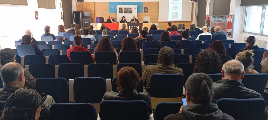 El acto de presentación del Front Antifeixista de la UA ha comenzado con unas palabras de representantes de las dos organizaciones convocantes SEPC y CGT, tomando la palabra en primer lugar Marina Ferrer por el SEPC, para a continuación, Juan Ramón Ferrandis Secretario General de la CGT del País Valenciano y Murcia, exponer la posición de la Confederación y su alineamiento histórico con el antifascismo.