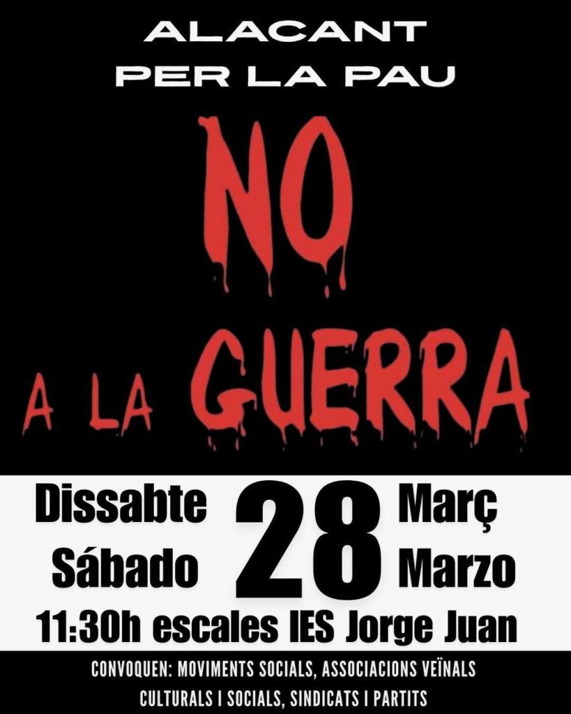 El sábado 28 de marzo, manifestación en Alicante contra la guerra, a las 11,30 horas desde el Jorge Juan, convocada por asociaciones, sindicatos y partidos políticos