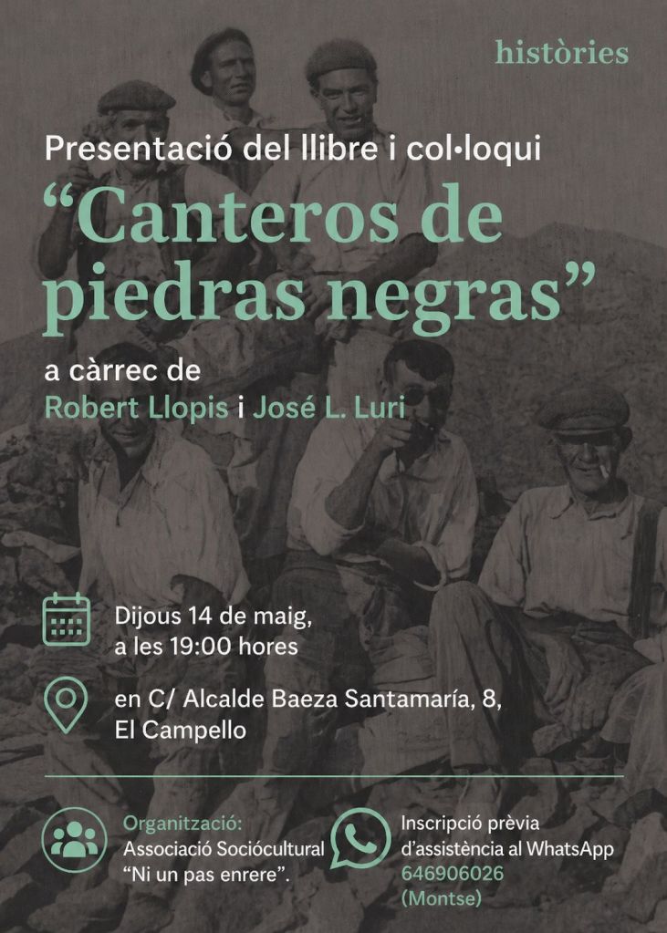 En C/ Alcalde Baeza Santamaría, 8 de El Campello. Robert Llopis y José L. Luri, autores de este libro, nos presentan una historia olvidada de unos canteros anarcosindicalistas que soñaban la revolución a golpes de martillo y de explosiones de dinamita. No faltes. Te vas a sorprender.