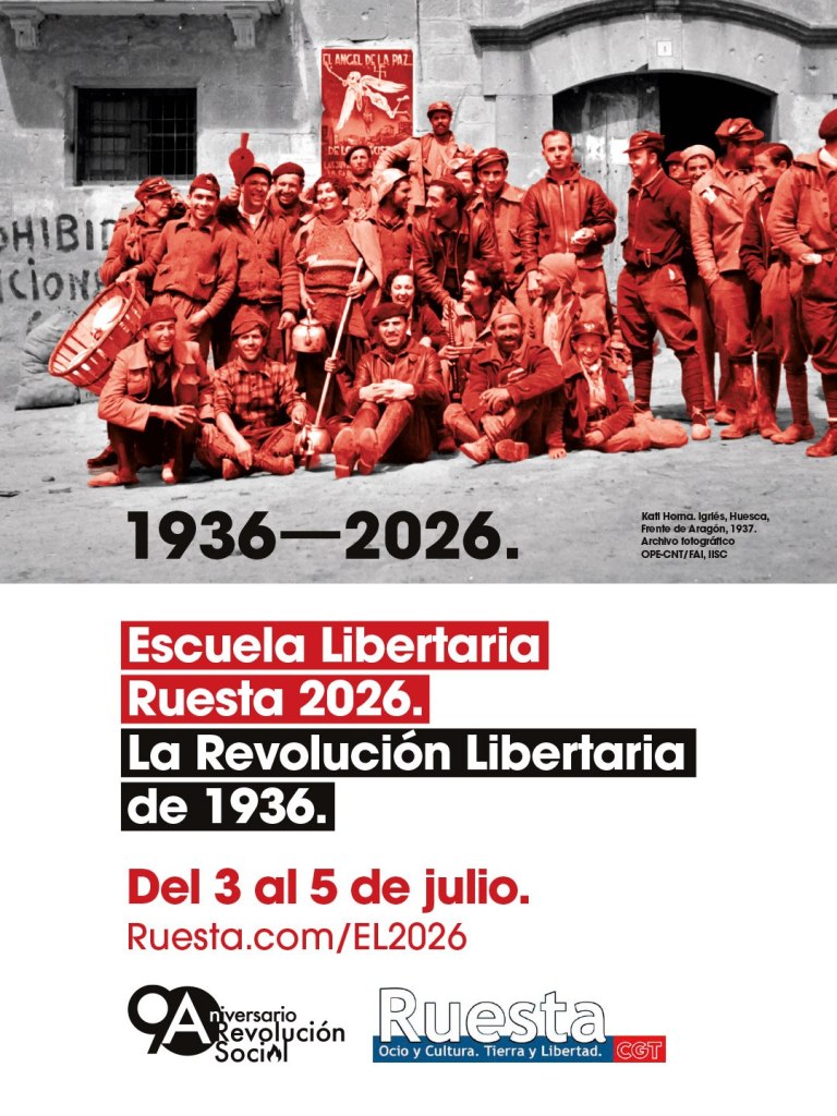 Anunciamos la celebración de la Escuela Libertaria de Ruesta 2026, que este año se a organizado en torno al 90 Aniversario de la Revolución Social de 1936, y en la que contaremos con la colaboración de Memoria Libertaria CGT y de la Fundación Salvador Seguí.